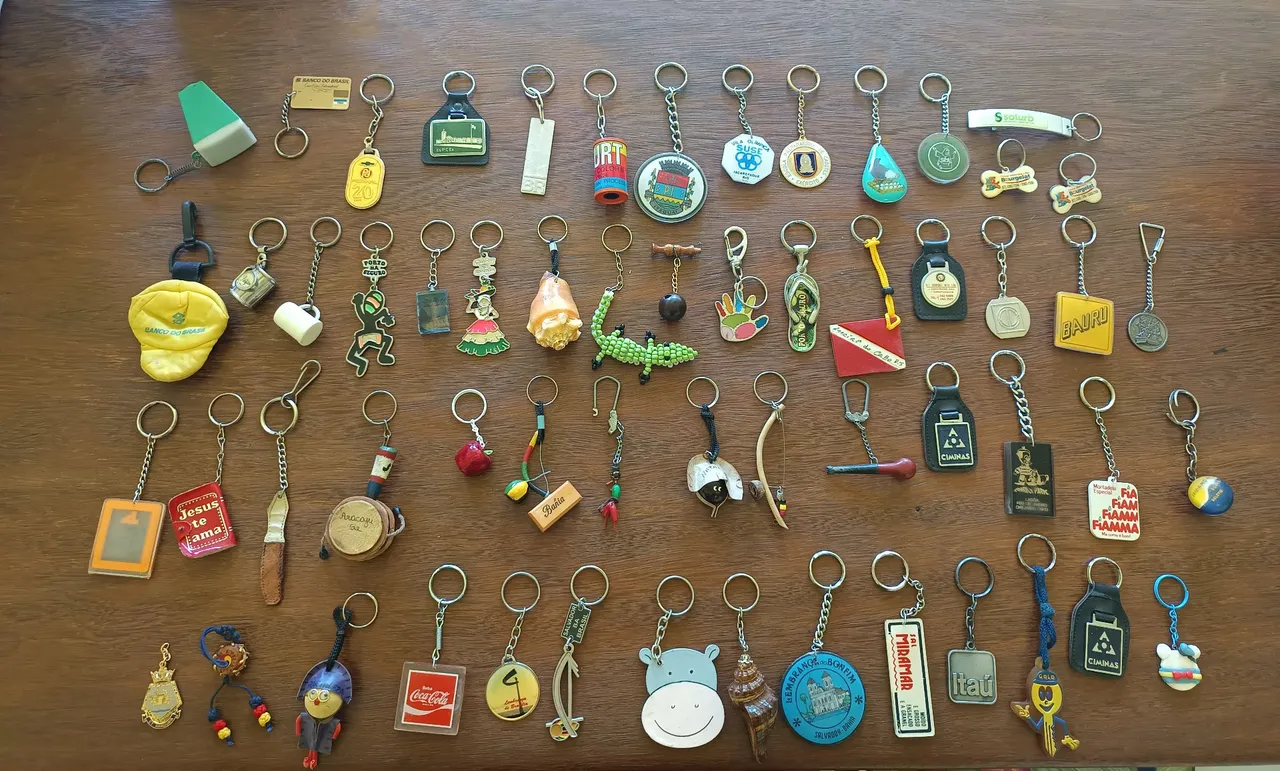Coleção de 58 chaveiros antigos e diversos, ideais para colecionadores e amantes de antiguidades. Uma variedade de designs e temas para você adicionar à sua coleção ou presentear alguém especial.