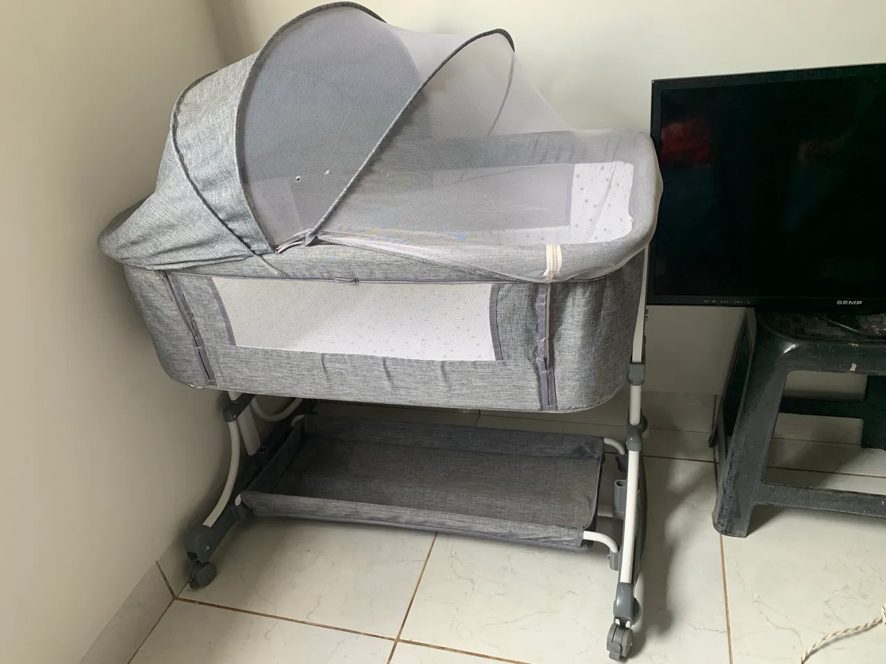 Moisés Side by Side com design moderno e confortável para o seu bebê. Possui tela mosquiteiro para proteger contra insetos, rodinhas para facilitar a movimentação e um amplo espaço interno. Proporcione noites tranquilas para o seu pequeno!