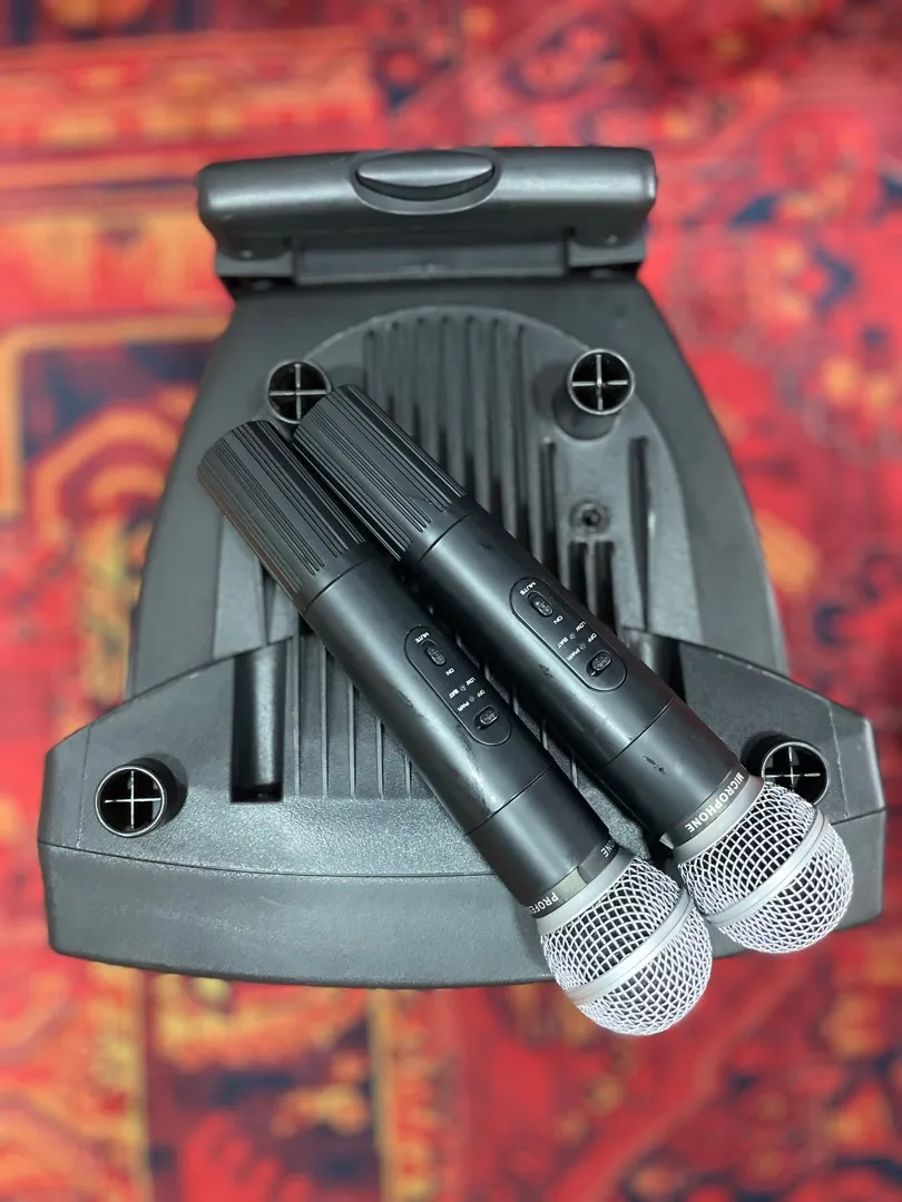 Caixa de som da marca "Ecopower EP-S201", usada, em ótimo estado de conservação. Possui rodinhas e alça para carregar. Inclui 2 microfones sem fio e 1 cabo de alimentação.