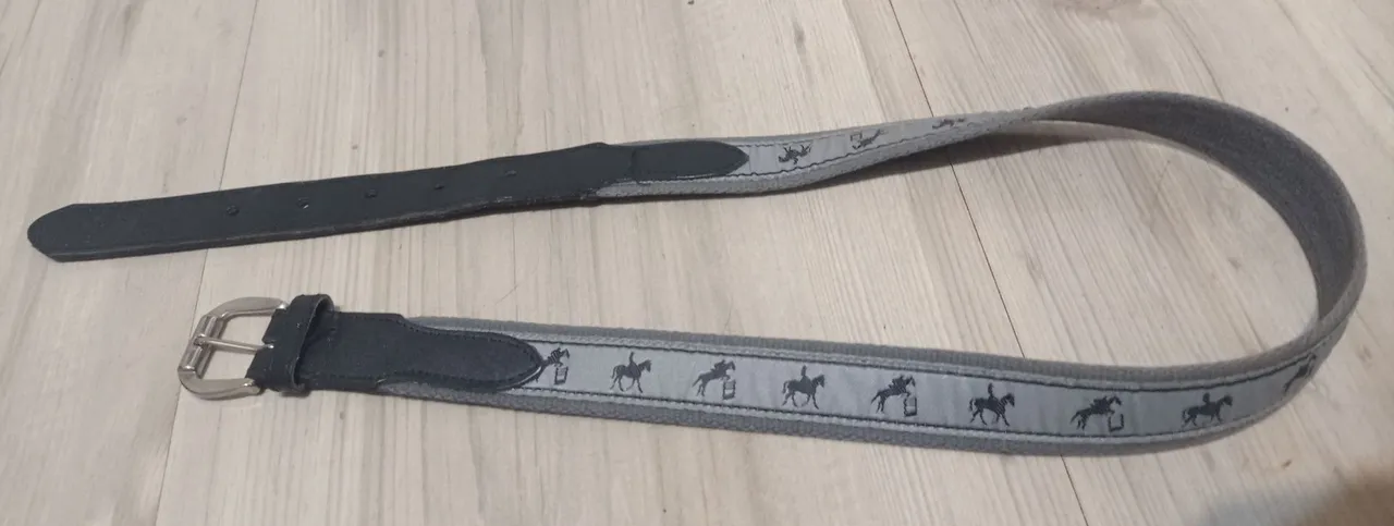 Cinto com estampa de cavaleiros e detalhes elegantes. Perfeito para completar seu uniforme de hipismo. 70cm de comprimento. Detalhes em couro.