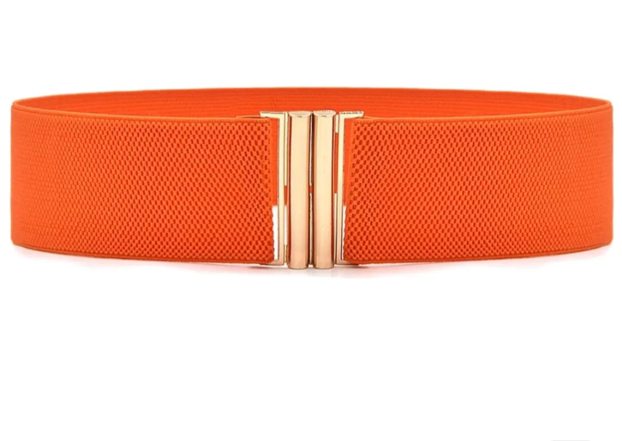 Cinto feminino elástico, cor laranja com fivela dourada. Largura 6cm. Novo, nunca usado.