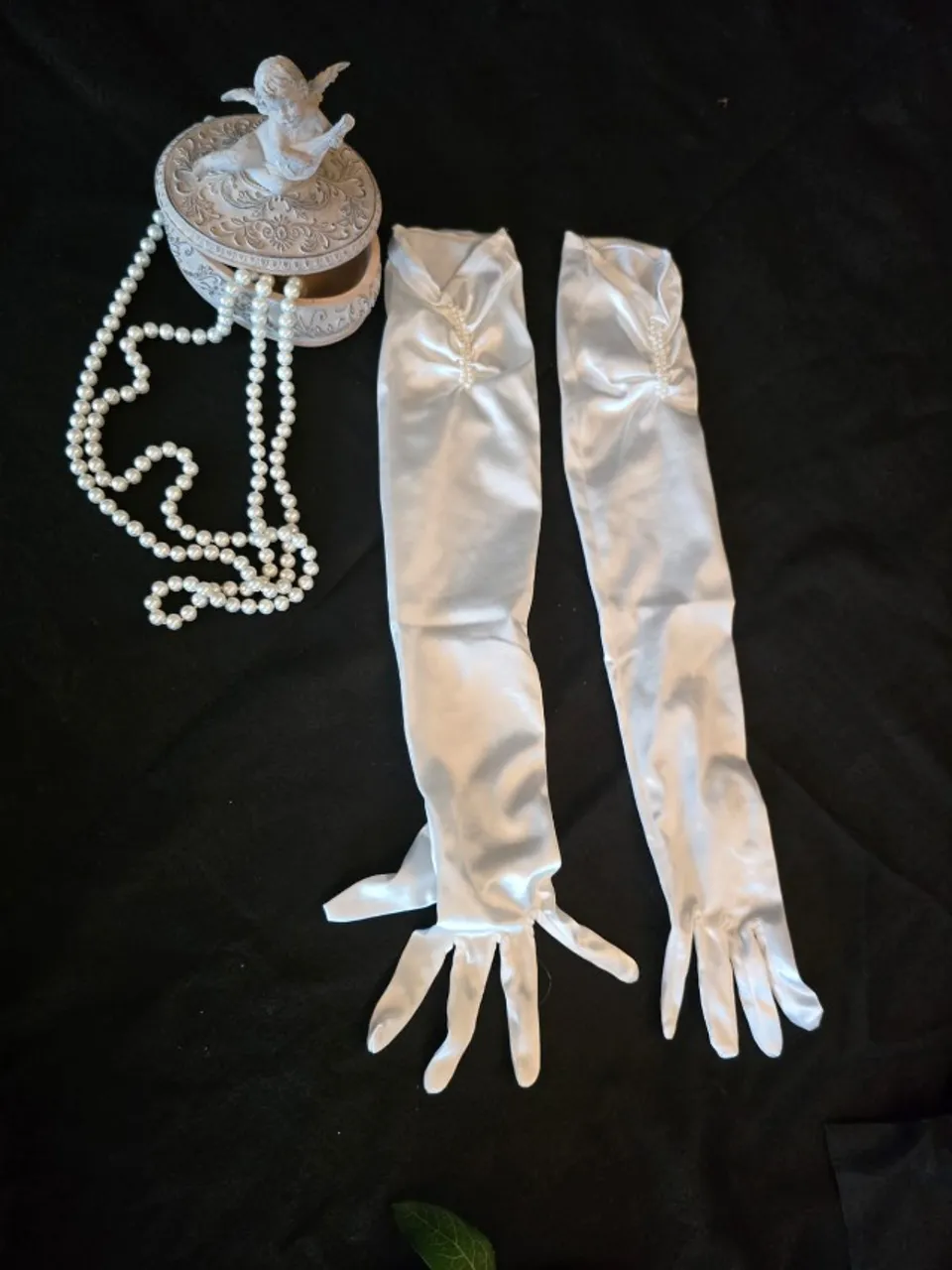 Adicione um toque de elegância atemporal ao seu visual de noiva com estas luvas deslumbrantes. Feitas com um tecido acetinado delicado, elas completam perfeitamente seu vestido, proporcionando um charme clássico e sofisticado.