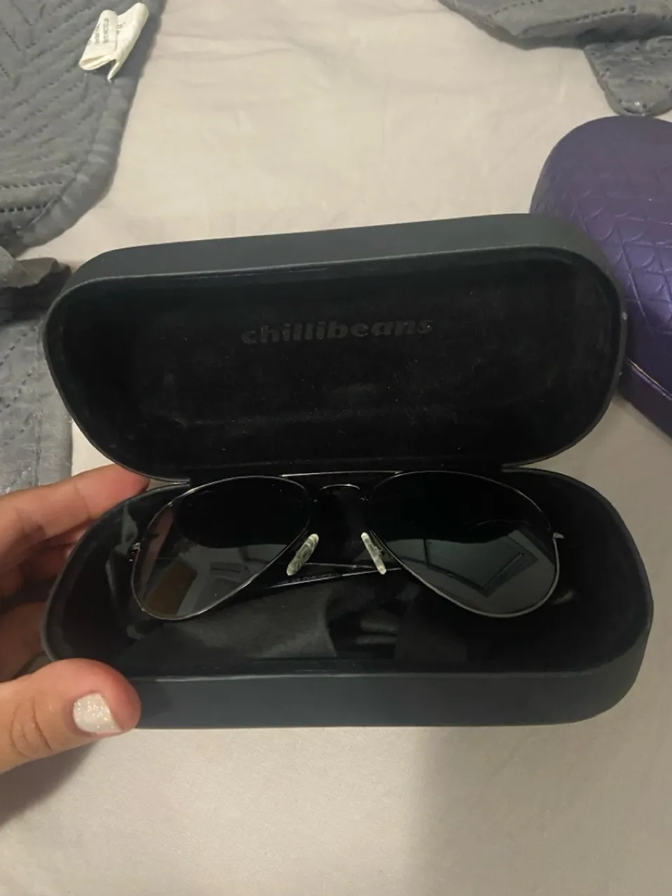 Óculos de sol Chilli Beans com design moderno e lentes escuras. Perfeito para proteger seus olhos com estilo e sofisticação. Acompanha case original.