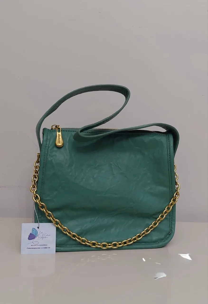 Linda bolsa verde com corrente dourada, perfeita para adicionar um toque de estilo ao seu visual. Ideal para diversas ocasiões, combinando elegância e praticidade.