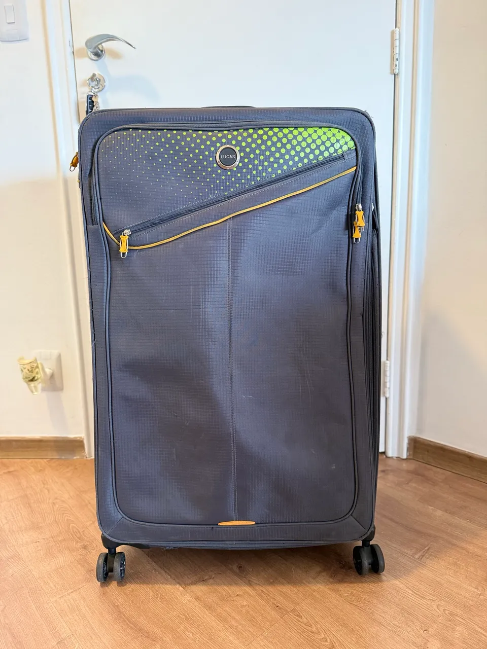 Está com algumas marcas no exterior, mas bem conservada no interior, todos os zíperes e rodinhas funcionando perfeitamente.