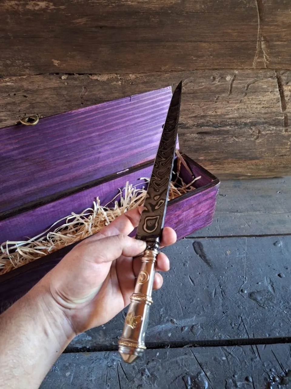 Faca em aço damasco com 500 dobras. Lâmina com design único e cabo elegante. Ideal para colecionadores e amantes de cutelaria.