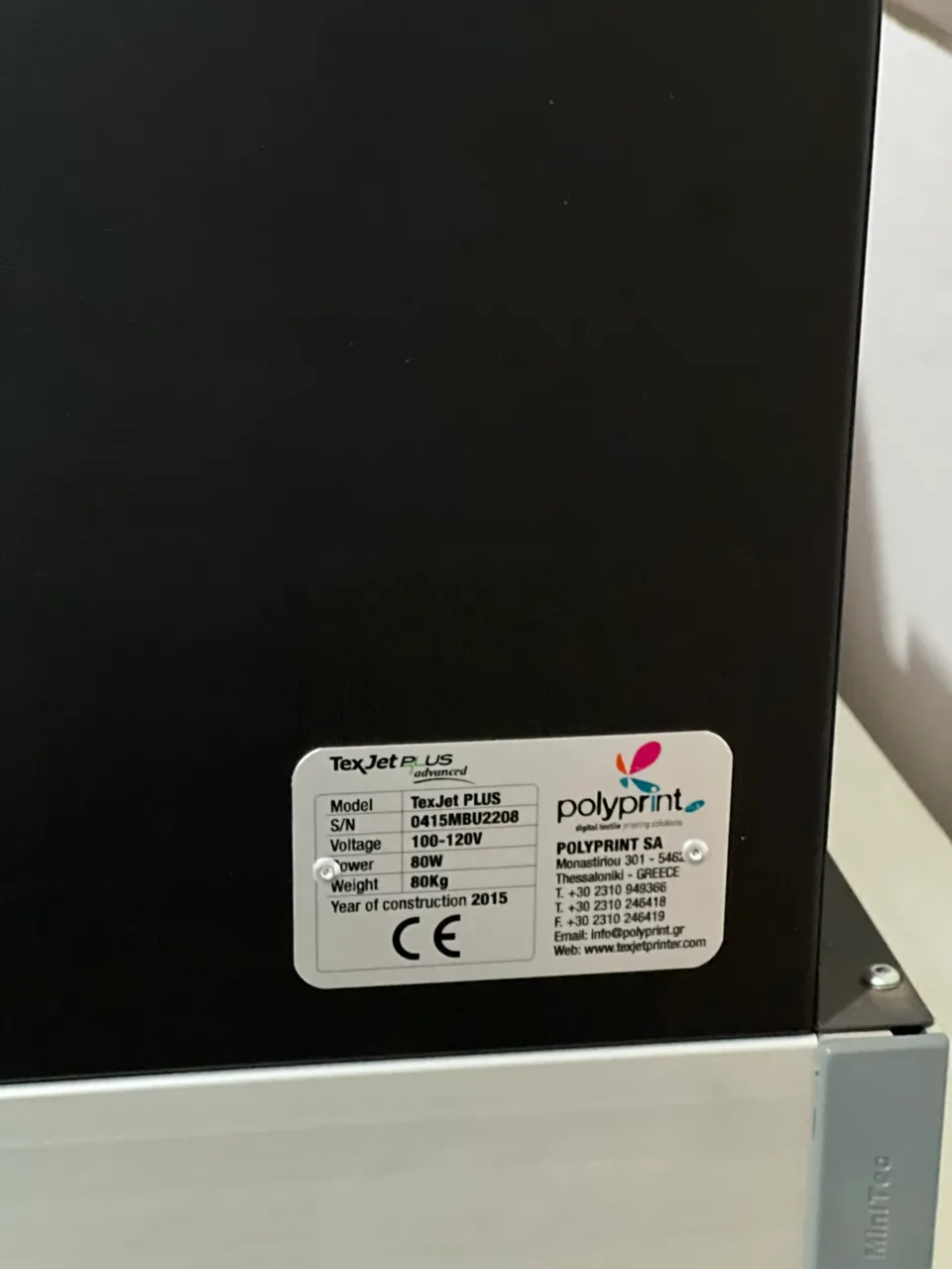 Impressora Polyprint TexJet Plus para impressão direta em tecidos de 15x30 até 34x56 cm, completa com pistola de pré-revestimento e alguns produtos. Tem 1 ano de uso, porém está parada a muitos anos. Necessita de manutenção.