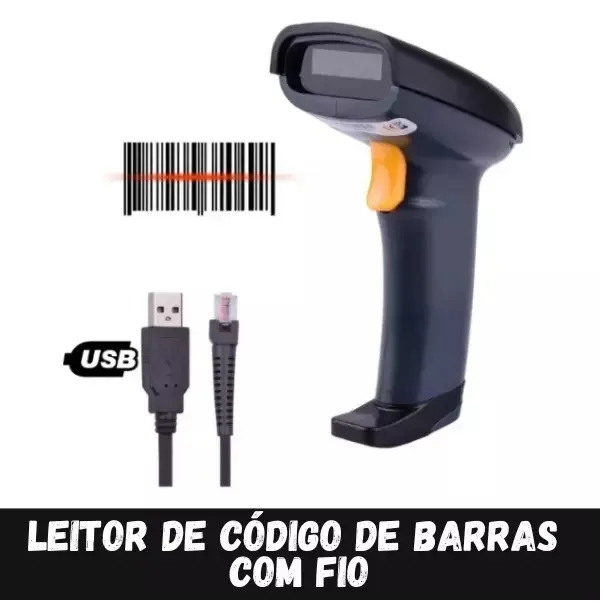 Leitor de código de barras com fio, ideal para agilizar suas vendas. Fácil de usar e eficiente, perfeito para otimizar seu negócio.