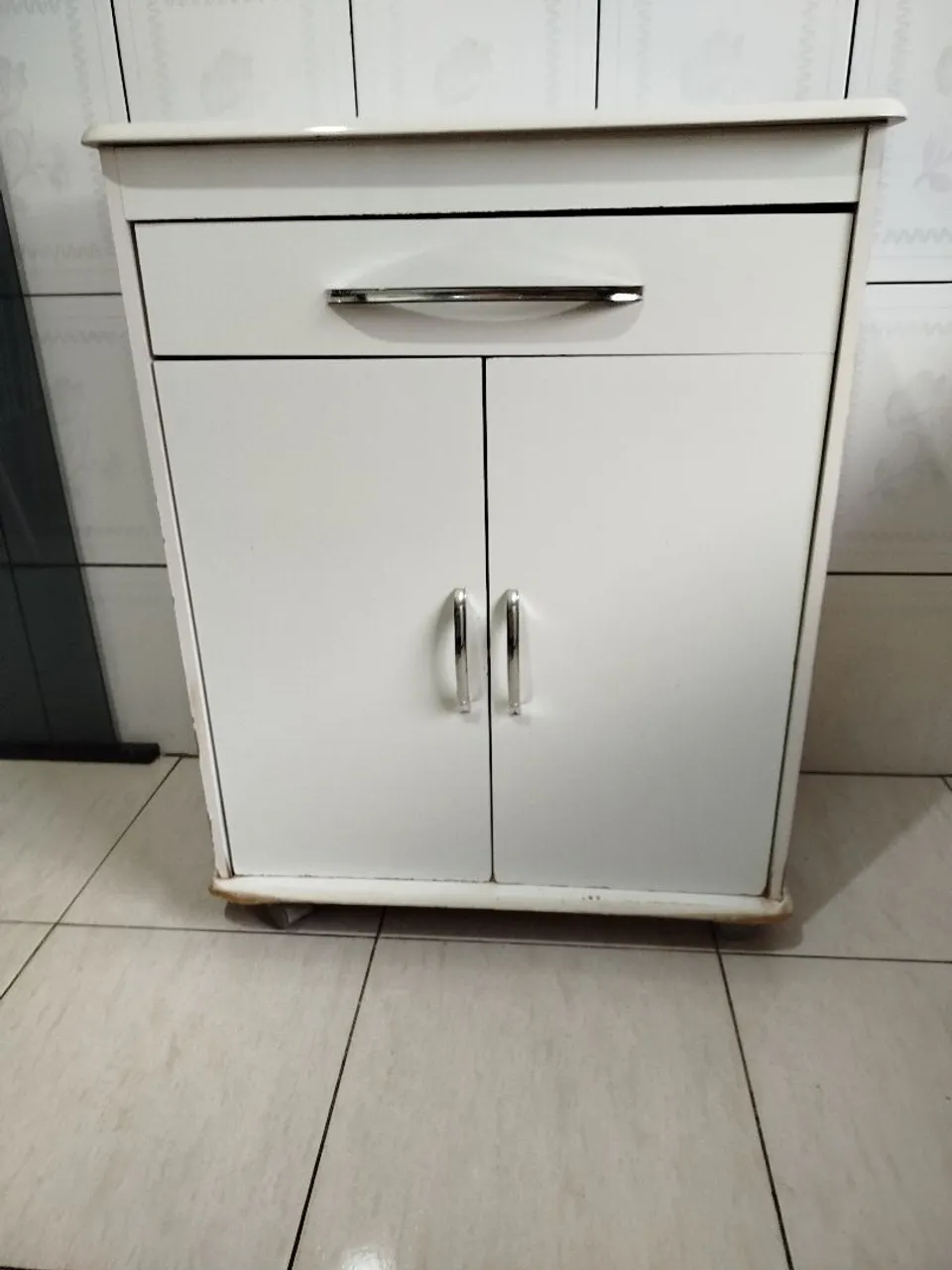 Balcão branco perfeito para organizar sua cozinha. Com design moderno e funcional, este balcão oferece espaço para microondas e outros itens, otimizando o ambiente.