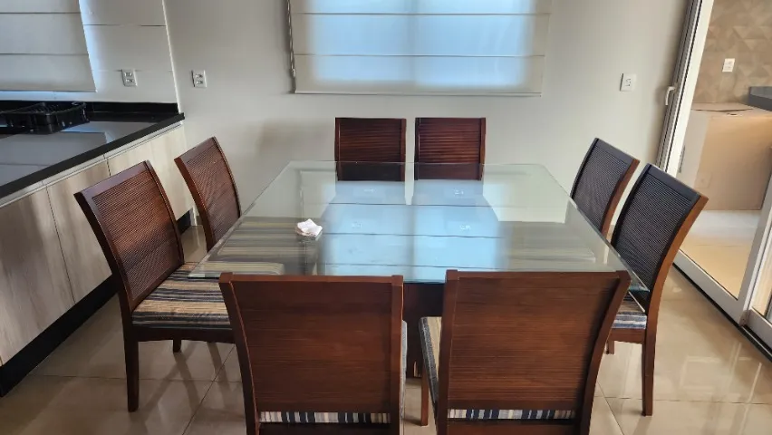 Linda mesa de jantar e barzinho com design elegante e sofisticado, perfeita para reunir a família e amigos em momentos especiais. Seu tampo de vidro e base em madeira trazem um toque de requinte para sua sala de jantar.