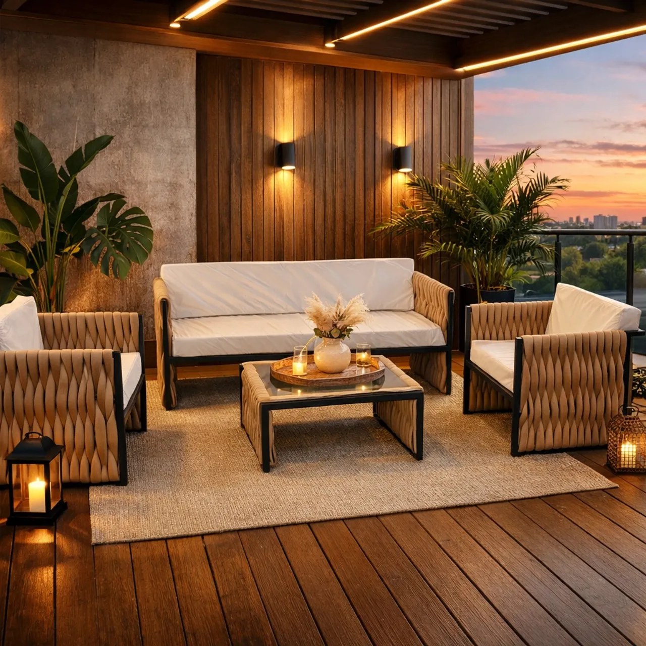 ? Conjunto de sofá em tricô náutico de alto padrão, fabricado com estrutura em alumínio barra forte e pintura eletrostática anti-ferrugem, composto por sofá, duas poltronas e mesa de centro, oferecendo conforto superior, alta durabilidade e acabamento sofisticado, perfeito para valorizar áreas externas, varandas e espaços gourmet.