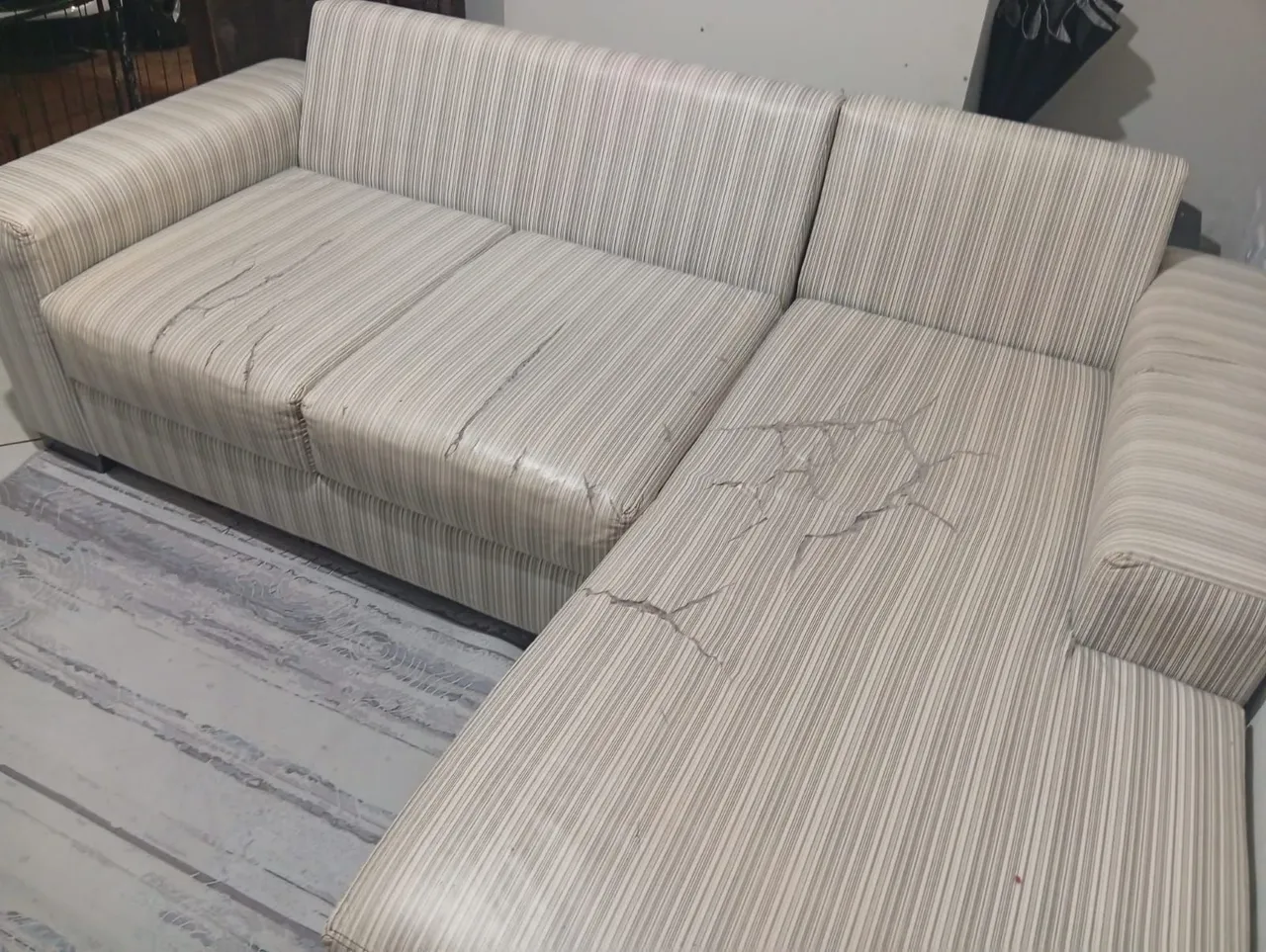 Sofá usado, revestimento rasgado, mas estrutura boa
